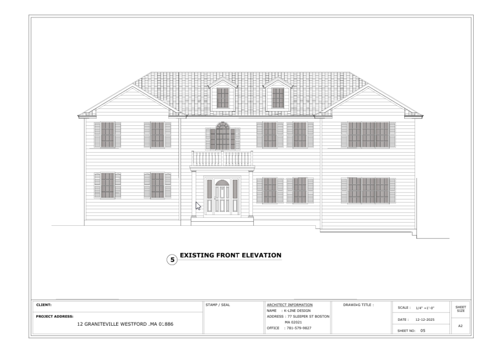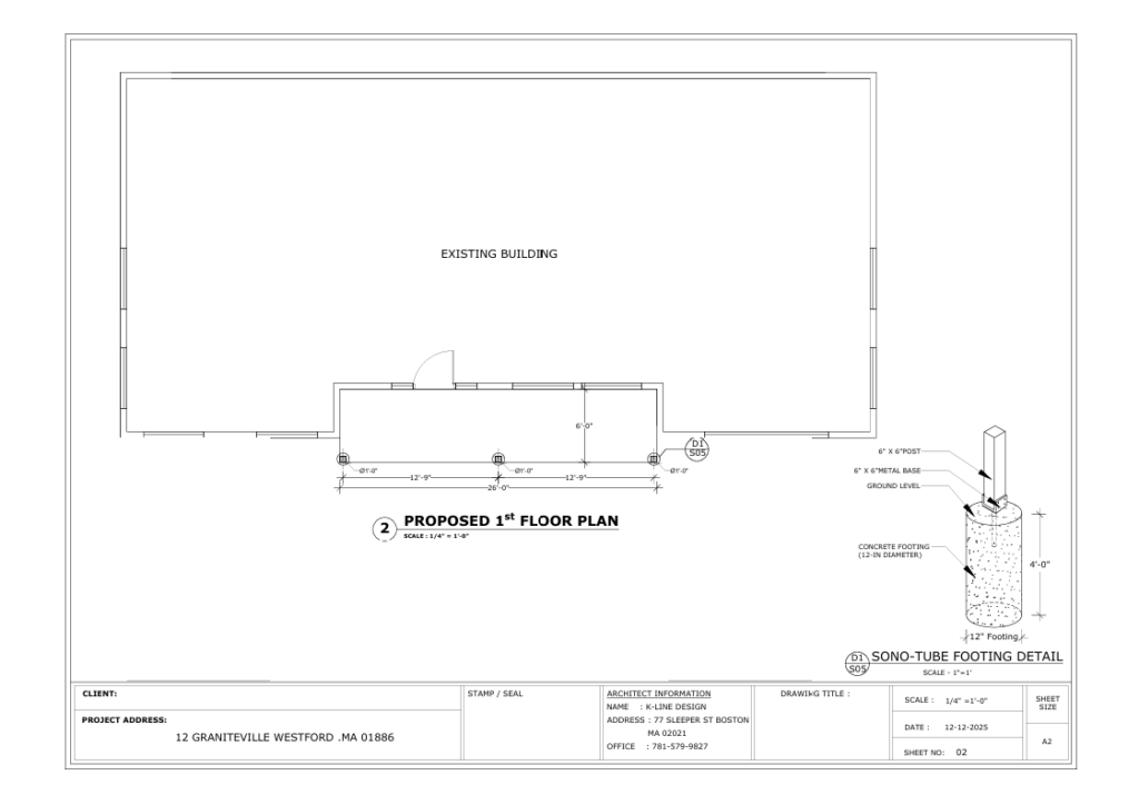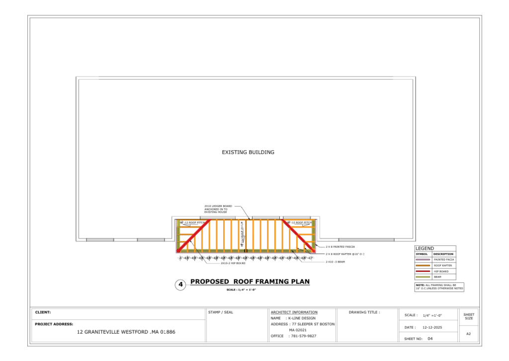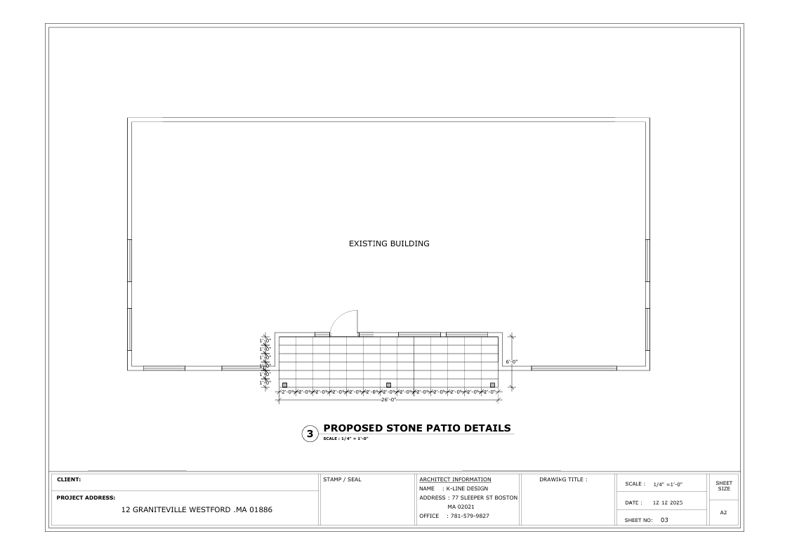A complete permit set including a 26’x12′ addition, structural roof framing analysis, and exterior stone patio detailing.